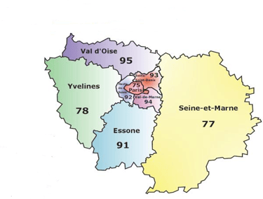 75 Paris - 77 Seine et Marne - 78 Yvelines -91 Essonne - 92 Haut de Seine - 93 Seine Saint Denis - 94 Val de Marne - 95 Val d'Oise