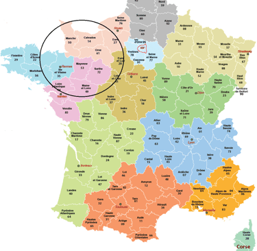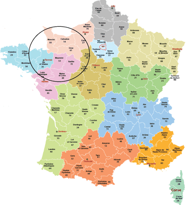 (27) Eure, (28) Eure et Loir, (14) Calvados, (50) Manche, (61) Orne, (53 Mayenne), (72) Sarthe), (49) Maine et Loire